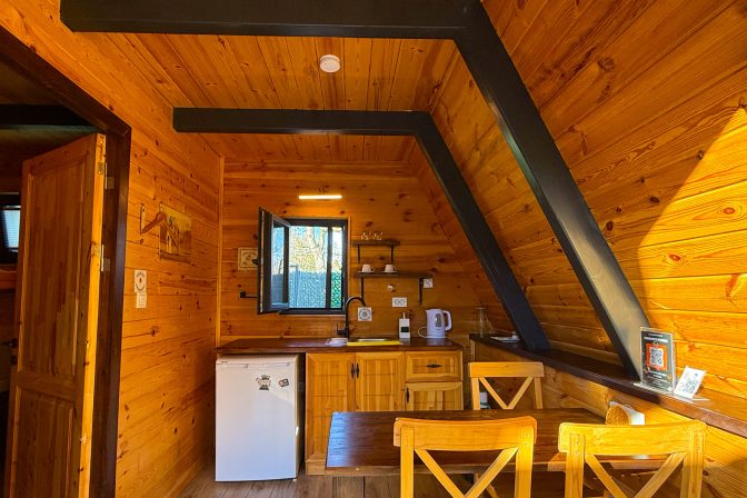 Yerden tavana uzanan geniş pencereler sayesinde doğayı bungalovun içinde hissedebilir, 32 metrekarelik oturma alanında rahat bir atmosferin tadını çıkarabilirsiniz. Mutfak bölümünde su ısıtıcısı, ocak, mini buzdolabı ve temel mutfak ekipmanları kullanımınıza hazır şekilde sunulmaktadır.