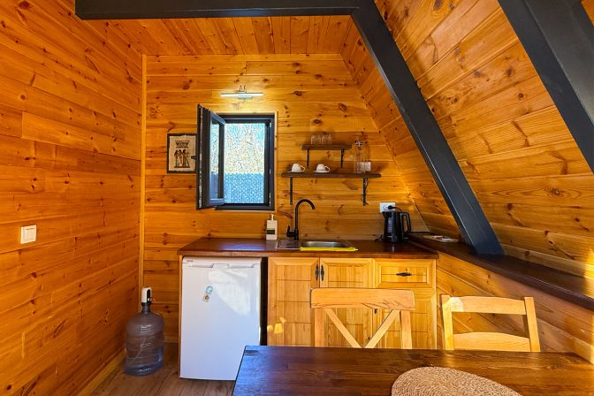 32 metrekarelik oturma alanında bulunan mutfakta; su ısıtıcısı, ocak, mini buzdolabı ve temel mutfak ekipmanları kullanımınıza hazır şekilde sunulmaktadır.