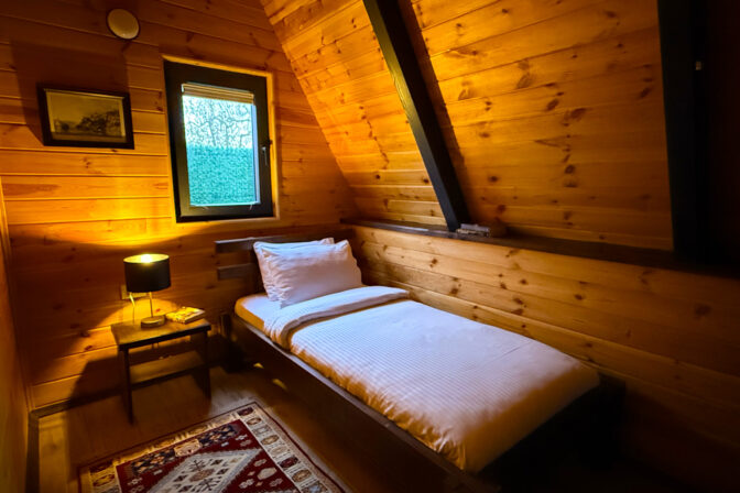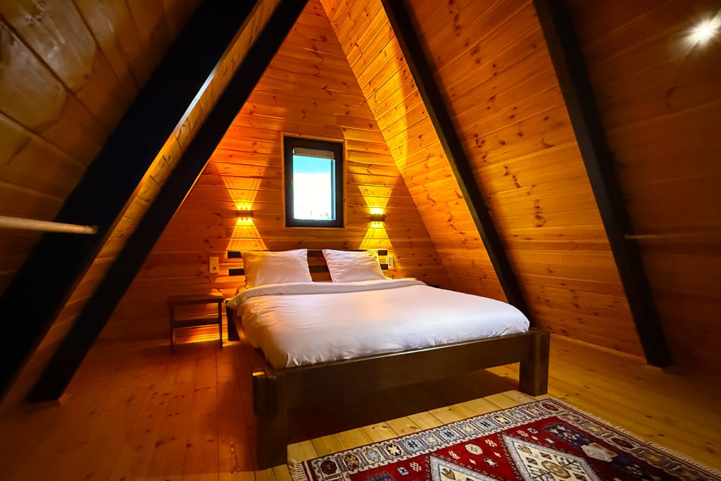 Bungalovumuz; çift kişilik yatağın bulunduğu asma kat ve tek kişilik ayrı yatak odası ile daha geniş konaklama imkânı sunar. Toplamda üç kişilik konaklama kapasitesine sahip olan bungalovumuz, ilave ücret ile katlanır yatak veya katlanır kanepe kullanılarak 4 kişiye kadar çıkarılabilmektedir.