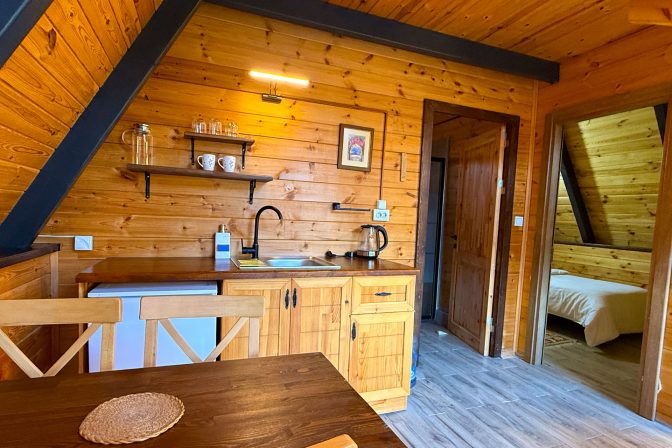 Yerden tavana uzanan geniş pencereler sayesinde doğayı yaşam alanınızın içinde hissedebilirsiniz. 42 metrekarelik geniş oturma alanında bulunan mutfakta; su ısıtıcısı, ocak, mini buzdolabı ve temel mutfak ekipmanları kullanımınıza hazır şekilde sunulmaktadır.